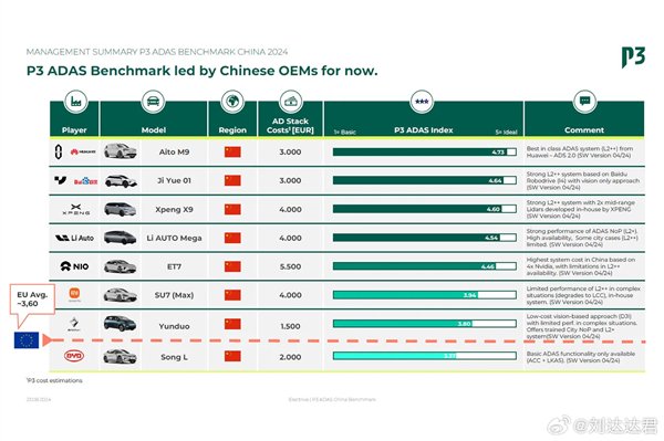 结果我们这家"德国某知名测试机构"在24年的一份测试报告P3 ADAS Benchmark被考古队扒了出来用于挑战懂车帝的结论,Tesla与中国车型的P3 ADAS测试排名结果。